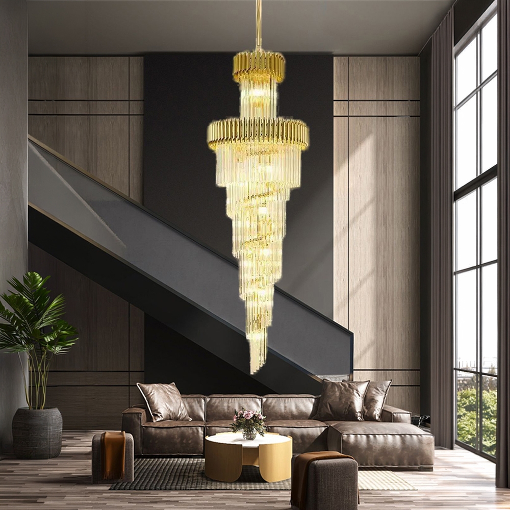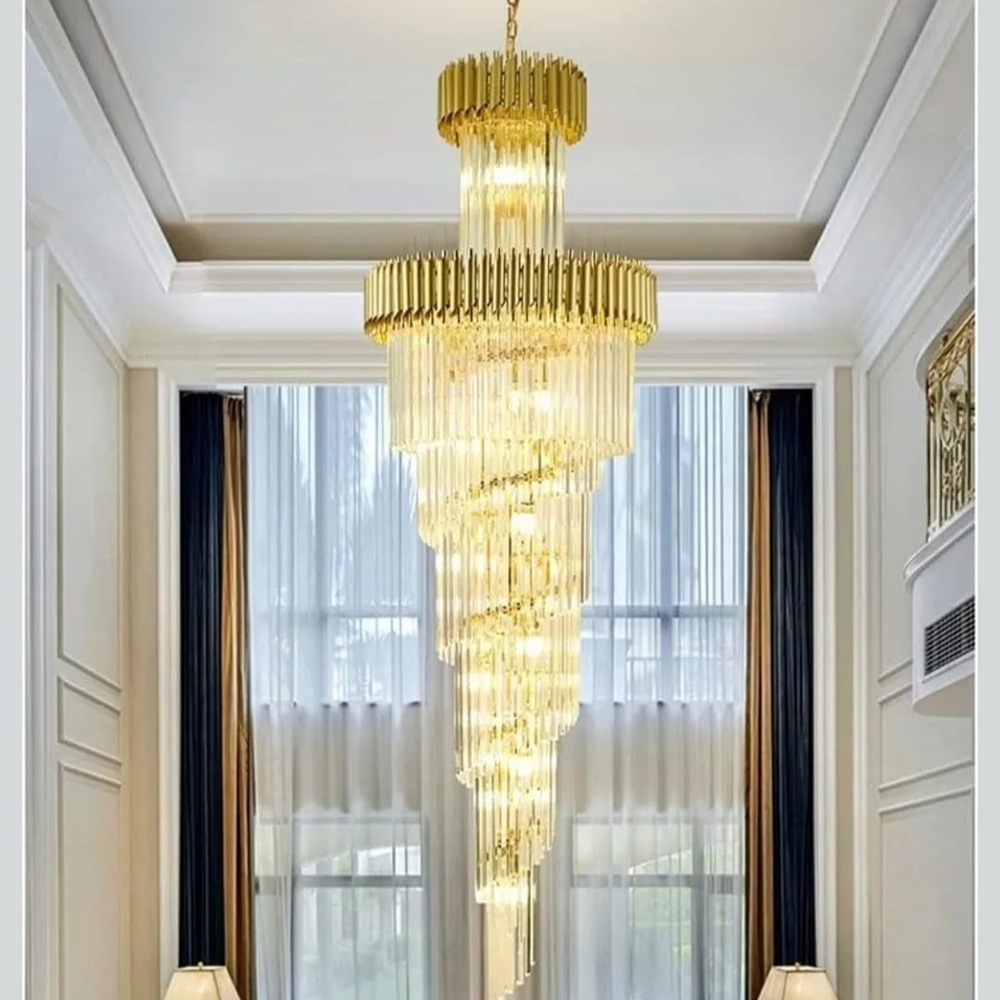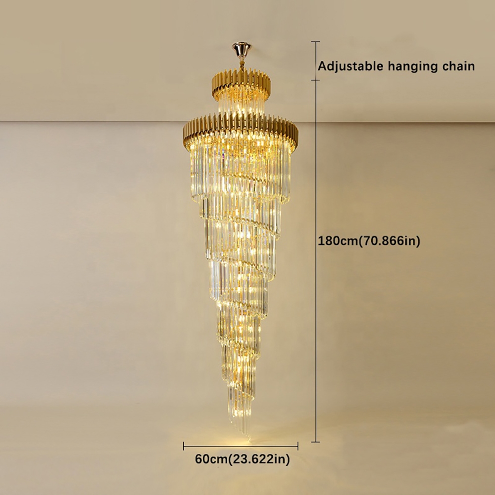 Designul în spirală, realizat din elemente din sticlă/cristal dispuse în cascadă, creează un efect vizual impresionant, amplificat de finisajul auriu care reflectă lumina într-un mod cald și sofisticat.