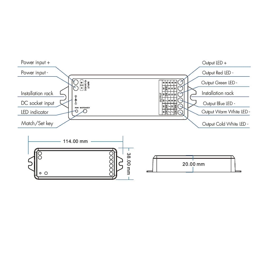 Dispozitivul functioneaza la o tensiune de 12–24V DC, cu o capacitate maxima de 15A, fiind compatibil cu instalatii LED de tensiune constanta. Selectarea modului de functionare (Mono / CCT / RGB / RGB+W / RGB+CCT) se face simplu, prin intermediul butonului dedicat de pe carcasa.