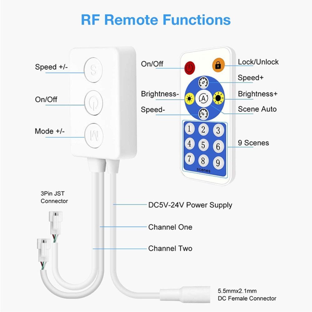 Controlerul functioneaza cu o plaja larga de tensiuni, intre 5V si 24V DC, fiind compatibil cu majoritatea benzilor LED Pixel disponibile pe piata.