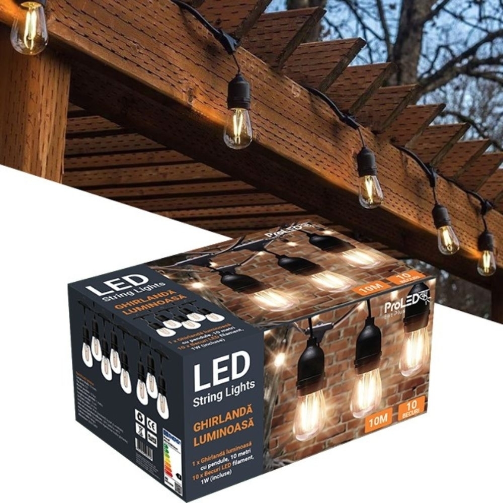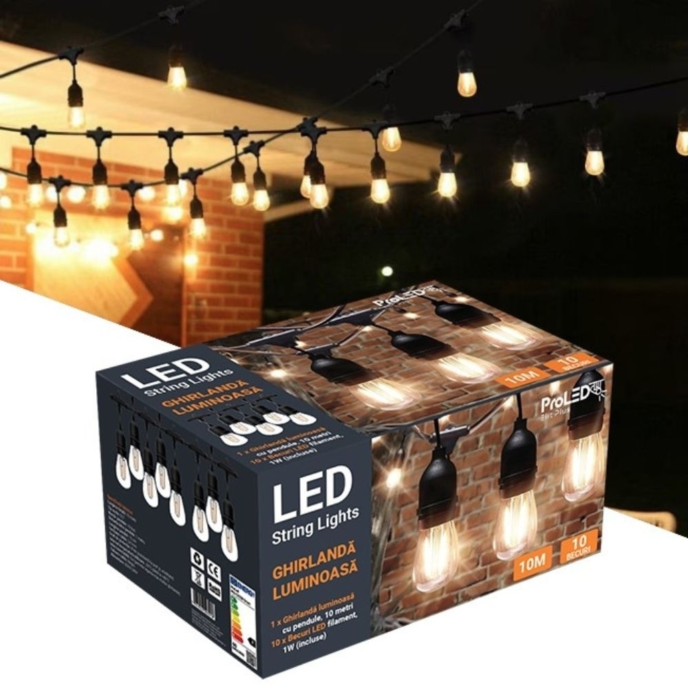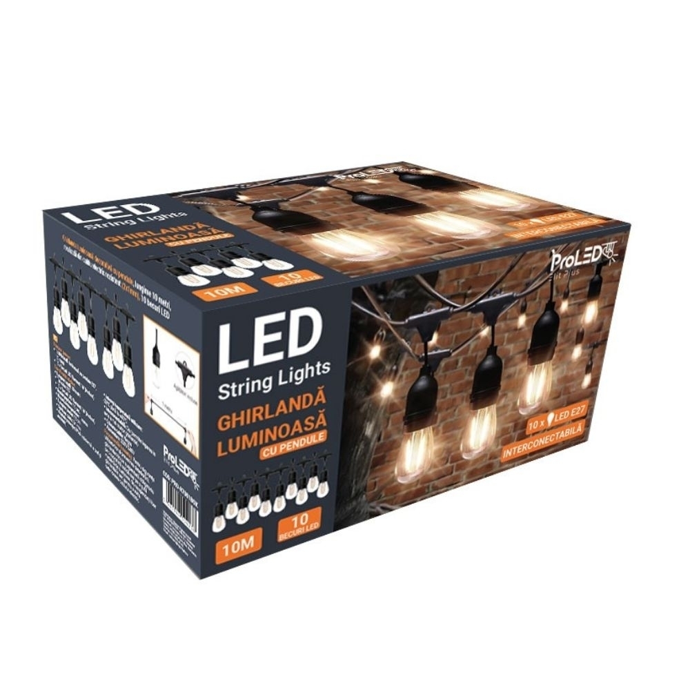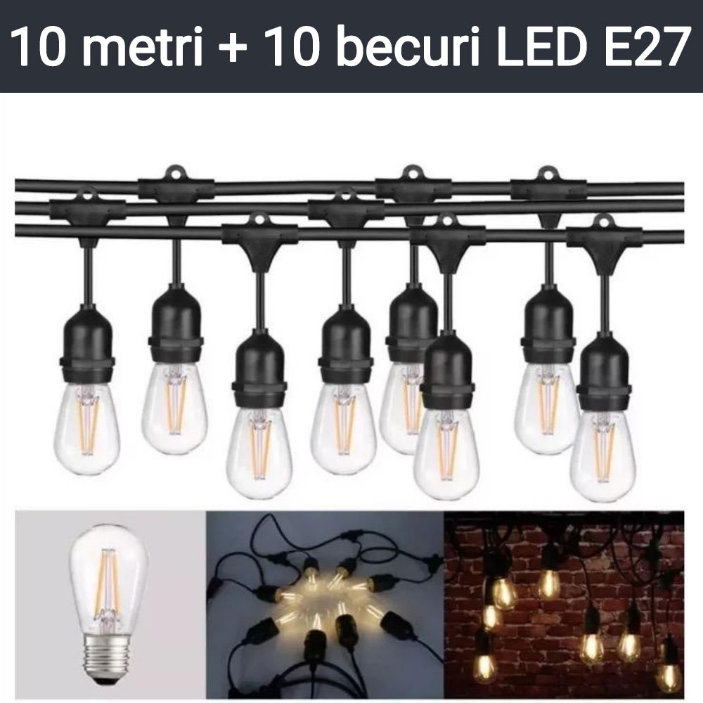 | Continut pachet | 1 ghirlanda 10m, 10 becuri LED filament E27, ambalaj individual |