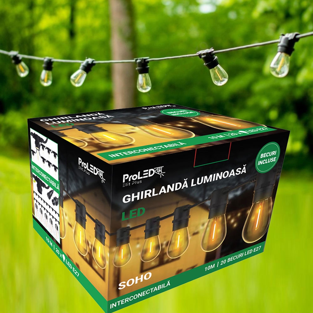 Ghirlanda luminoasa SOHO cu lungimea de 10 metri si 20 fasunguri E27 este ideala pentru iluminat decorativ in gradini, terase, restaurante sau evenimente. Include becuri LED filament de 1W care ofera lumina ambientala placuta si consum redus de energie.