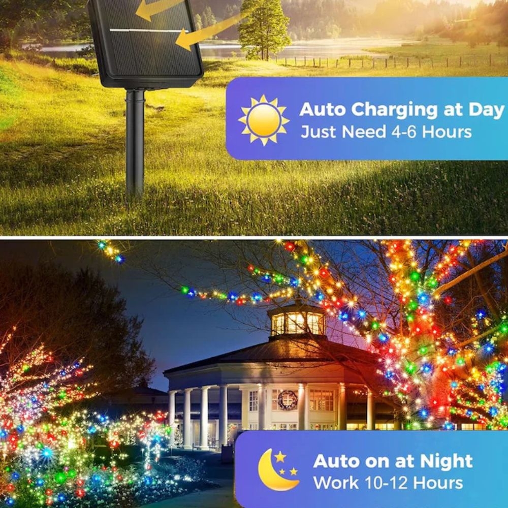 Instalatiile craciun exterior multicolor 12m cu 100 LED transform a instant orice spatiu intr-un decor festiv si colorat, fara sa ai nevoie de prize sau prelungitoare. Panoul solar integrat capteaza energia de la soare pe parcursul zilei, iar instalatia se aprinde singura cand se lasa seara.