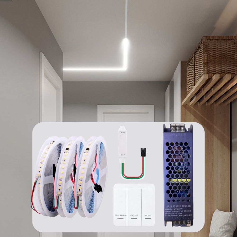 Pachetul este livrat gata de instalare, incluzand controller dedicat pentru efecte Waterfall si alimentator de 24V, 400W, IP20, dimensionat corect pentru lungimea mare a benzii si pentru functionare stabila fara pierderi de putere.