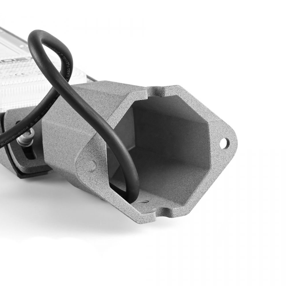 Carcasa din aliaj de aluminiu si dispersorul din policarbonat garanteaza rezistenta mecanica (IK07) si durabilitate pe termen lung. Montajul se face pe stalpi cu diametru maxim de 60 mm sau pe perete, cu posibilitate de ajustare verticala la 30°.