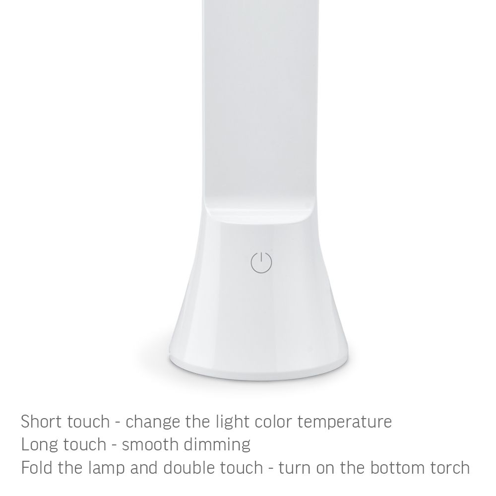 VIDEX TF11 BERLIN is a portable LED table lamp with the functions of stepless dimming and color temperature change (3000K, 4000K, 5500K). Thanks to the built-in battery, the lamp does not require constant connection to the power supply and can work up to 10 hours on a full charge. The lamp has an additional light source at the base, so it can be used as a flashlight. The lamp is controlled by a single touch button. The light of the lamp does not flicker and does not tire the eyes during prolonged operation. The body of the lamp is made of smooth and shiny white plastic.