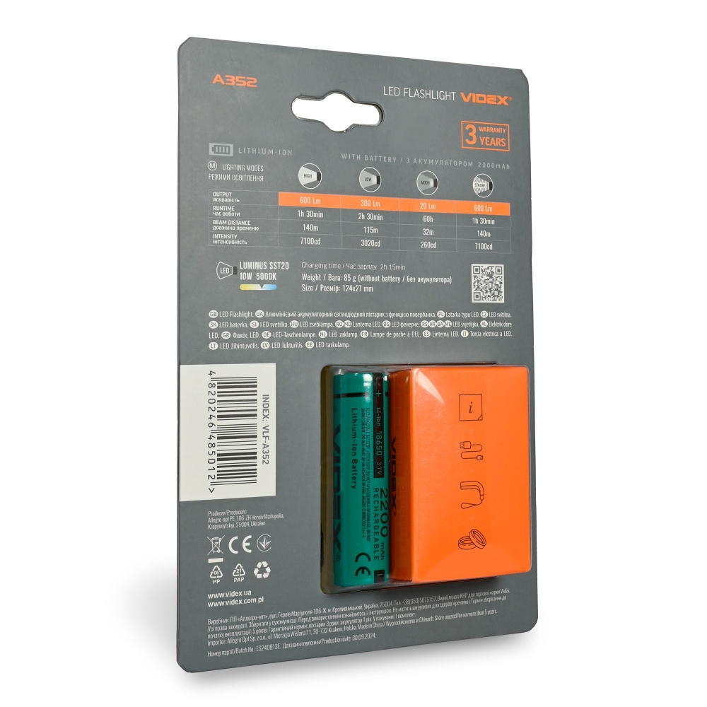 LED Portable Flashlight VIDEX VLF-A352 600Lm 5000K is designed for individual use during nighttime or in indoor areas without lighting. Its key features include tightness, a durable housing, and light range. It allows selecting the required operating mode. A flashlight cord is used, providing convenient use and transportation. The set also includes a clip that allows you to attach the flashlight to a backpack, belt, baseball cap, or other suitable places. A distinctive feature of this model is the presence of a USB-A output (5V, 1A) on the flashlight body for charging a phone or other gadgets in emergency situations when needed.