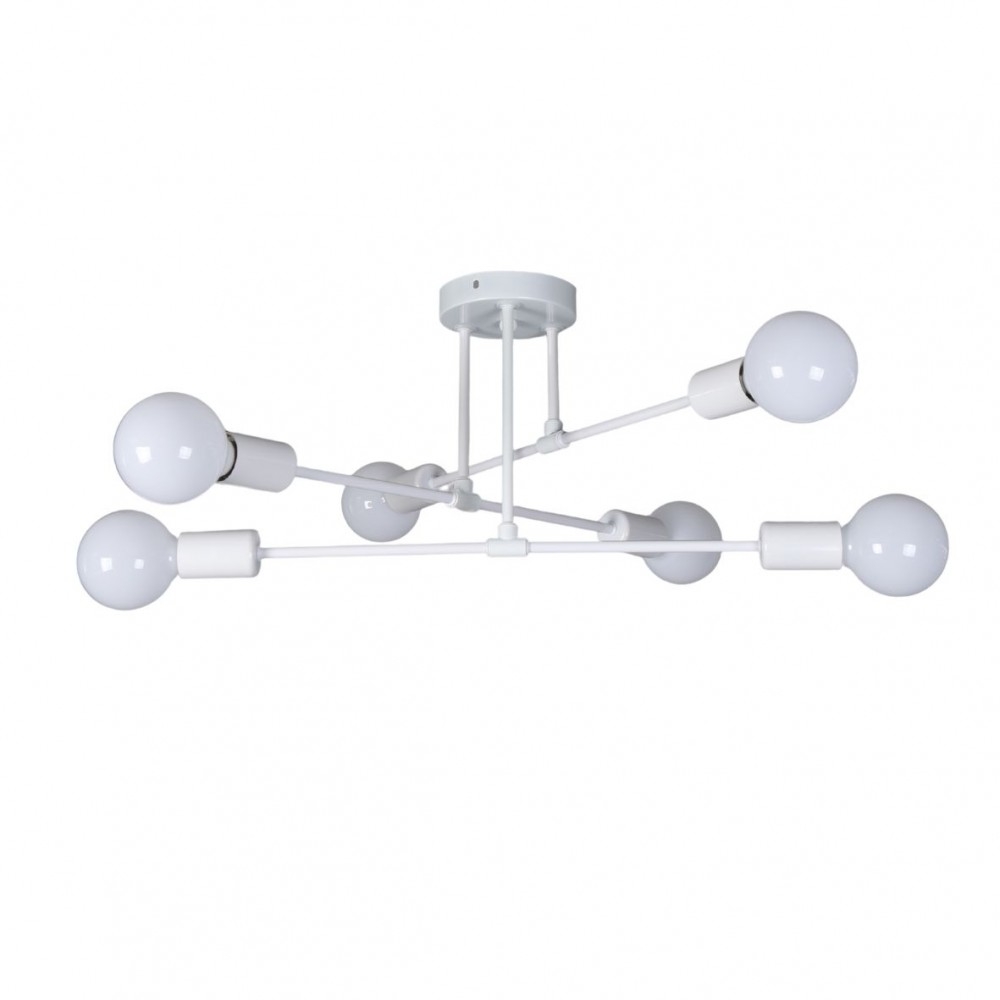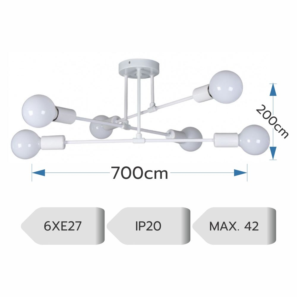 Designul cu 6 brațe dispuse radial asigură o distribuție uniformă a luminii, fiind potrivit pentru living, dormitor sau birou. Formatul compact (tip plafonieră) o face ideală și pentru camere cu tavan mai jos.
