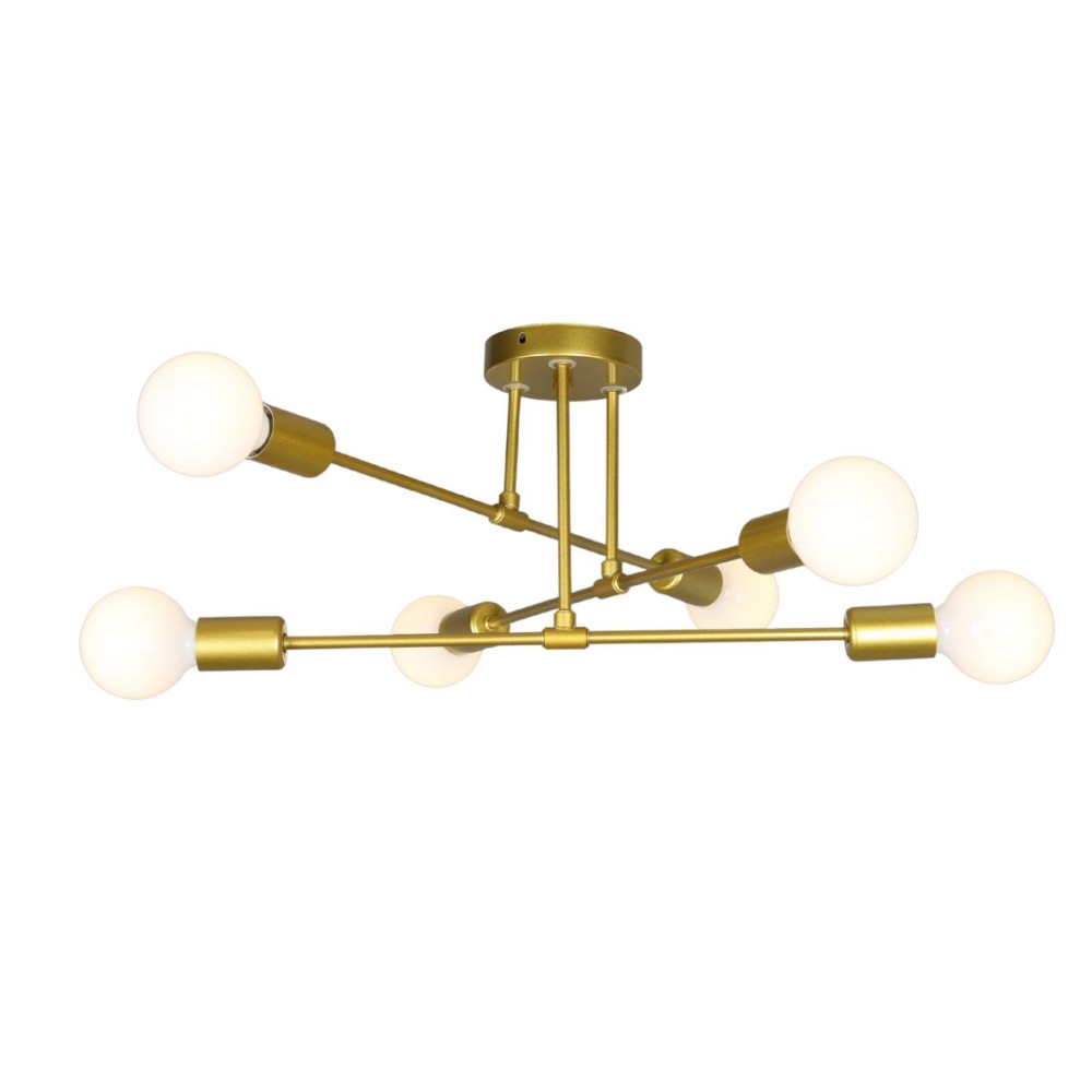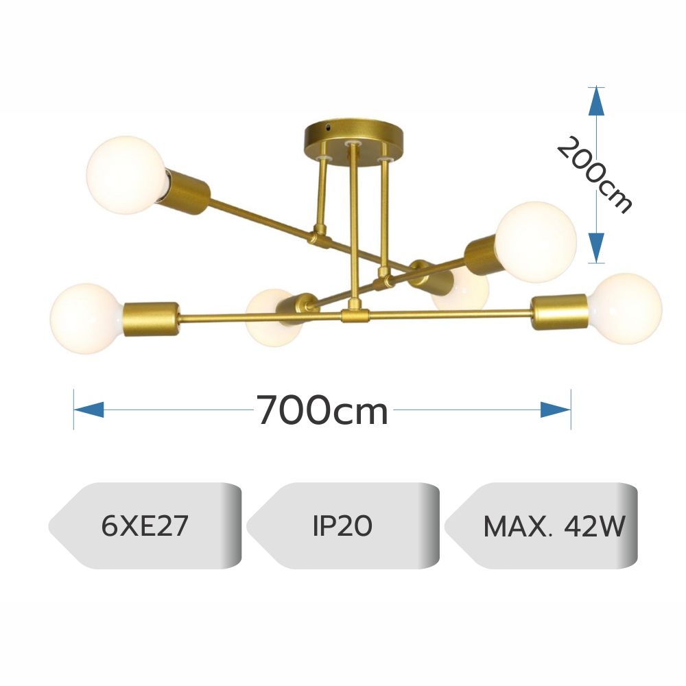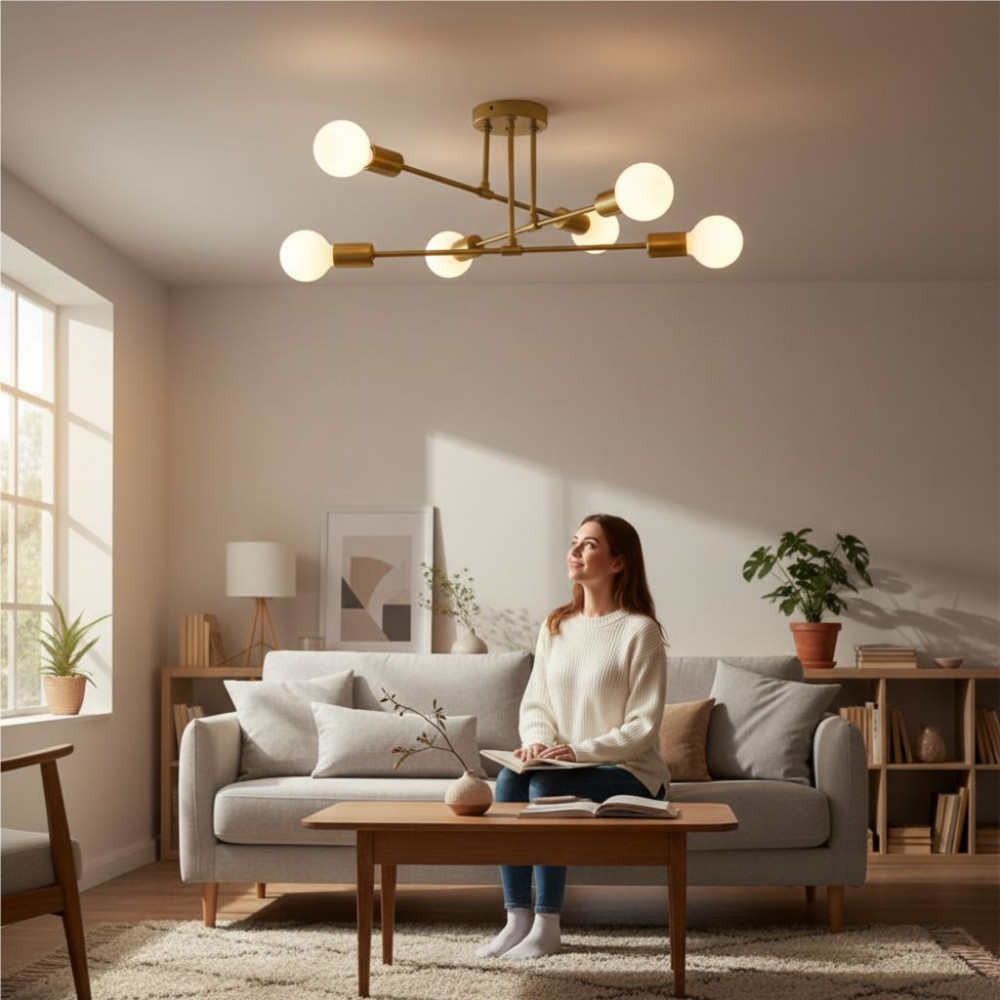 Designul cu 6 brațe dispuse radial oferă o distribuție uniformă a luminii, fiind potrivit pentru living, dormitor sau birou. Formatul compact (tip plafonieră) o face ideală și pentru camere cu tavan mai jos.