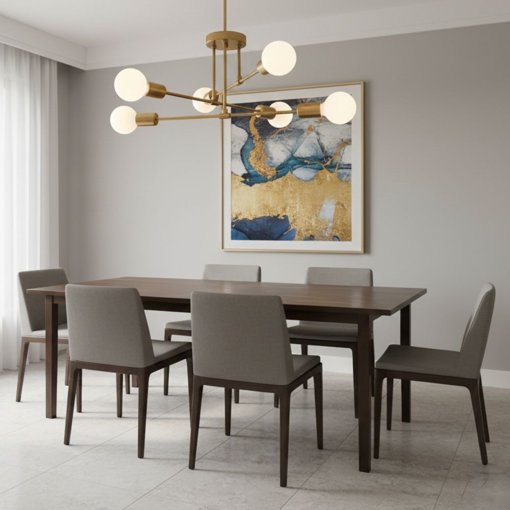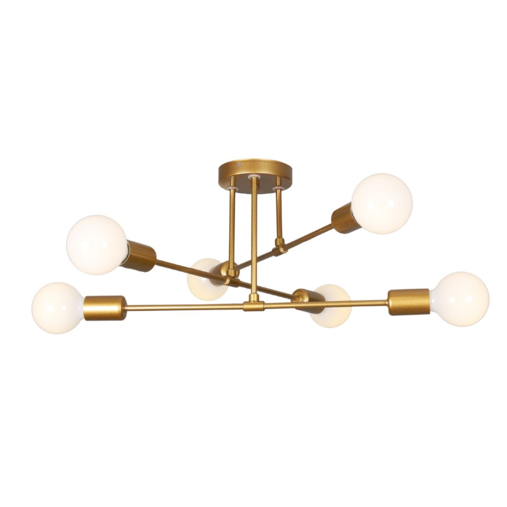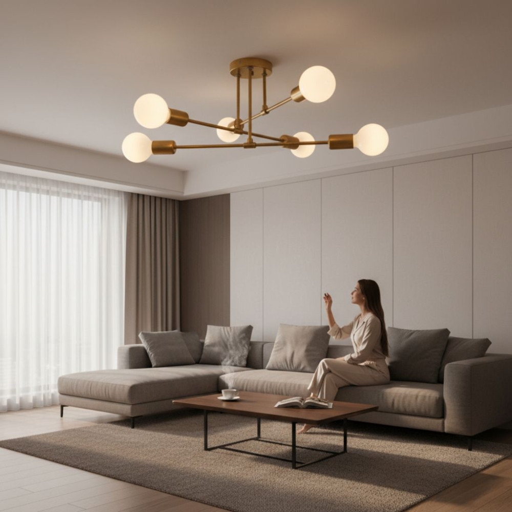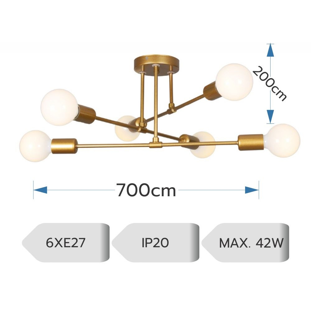 Designul cu 6 brațe dispuse radial oferă o distribuție uniformă a luminii, fiind potrivit pentru living, dormitor sau birou. Formatul compact (tip plafonieră) o face ideală și pentru camere cu tavan mai jos.