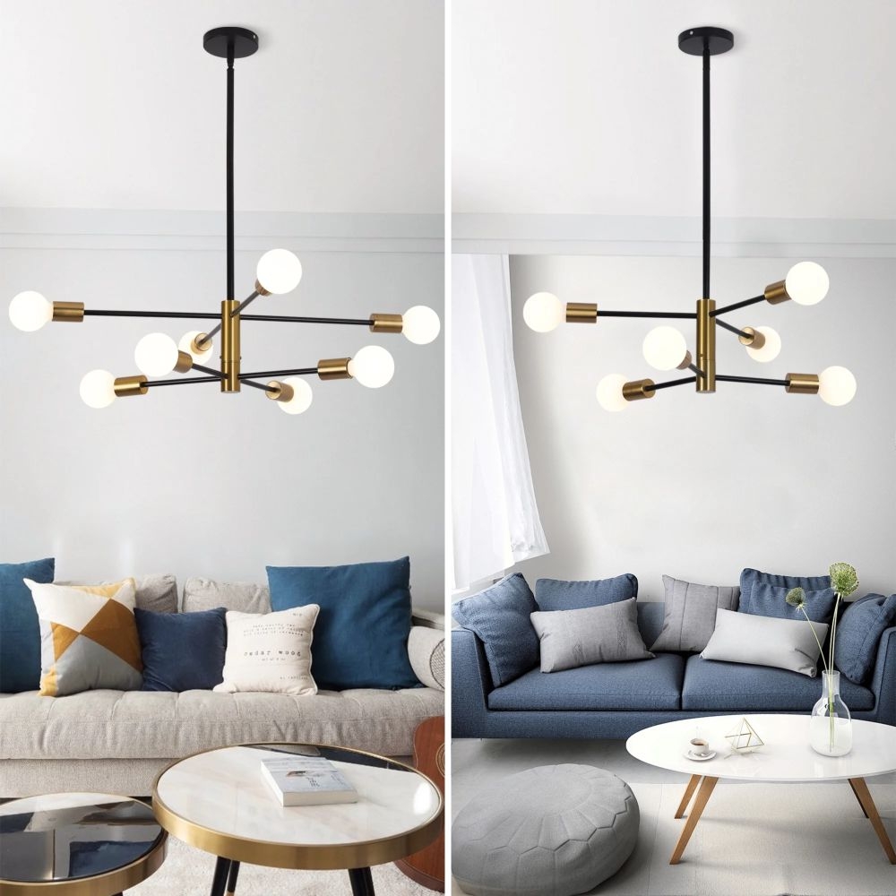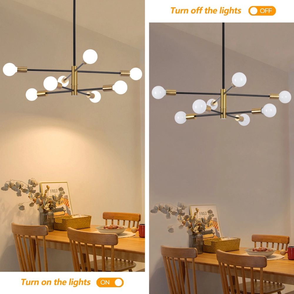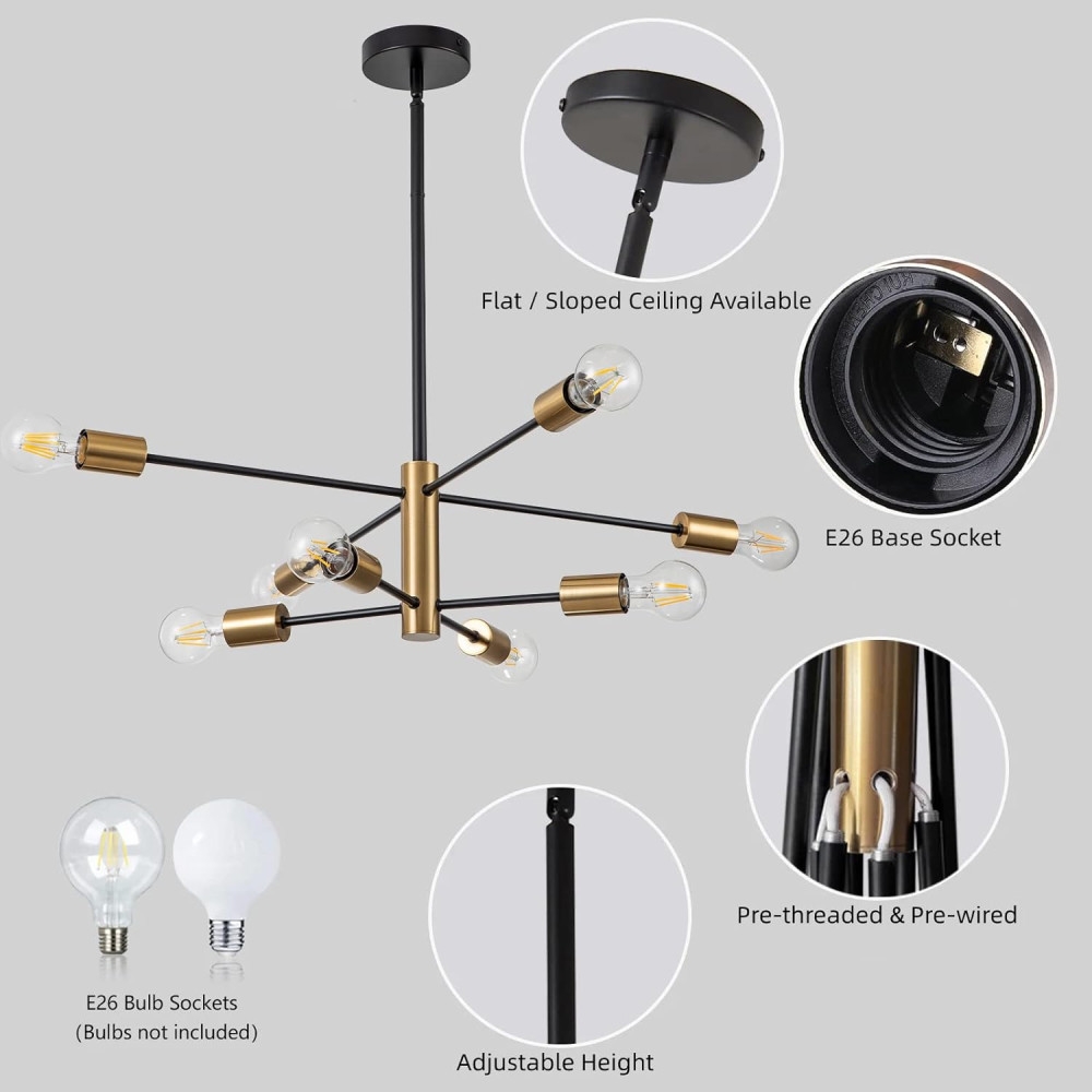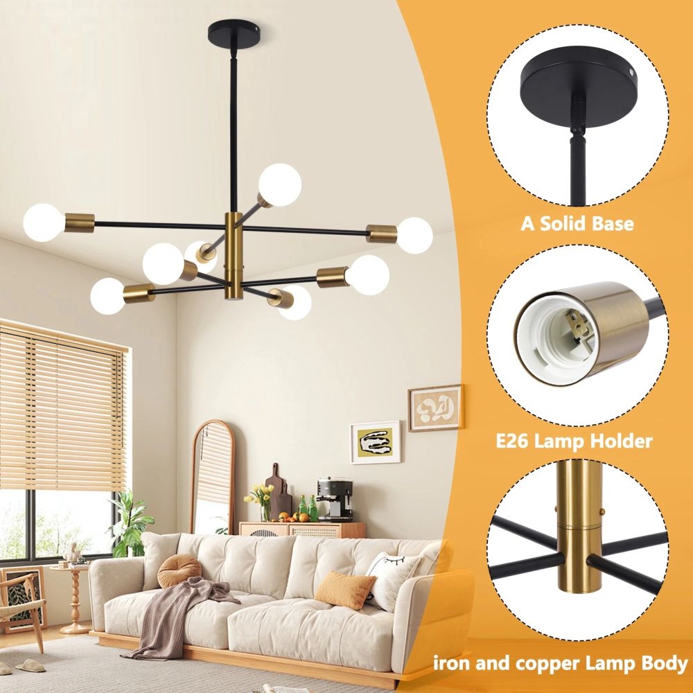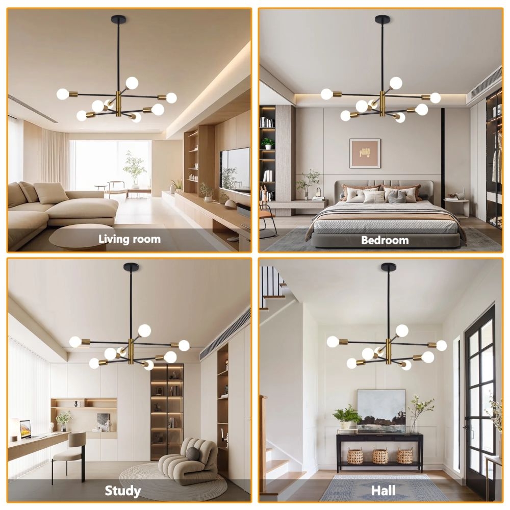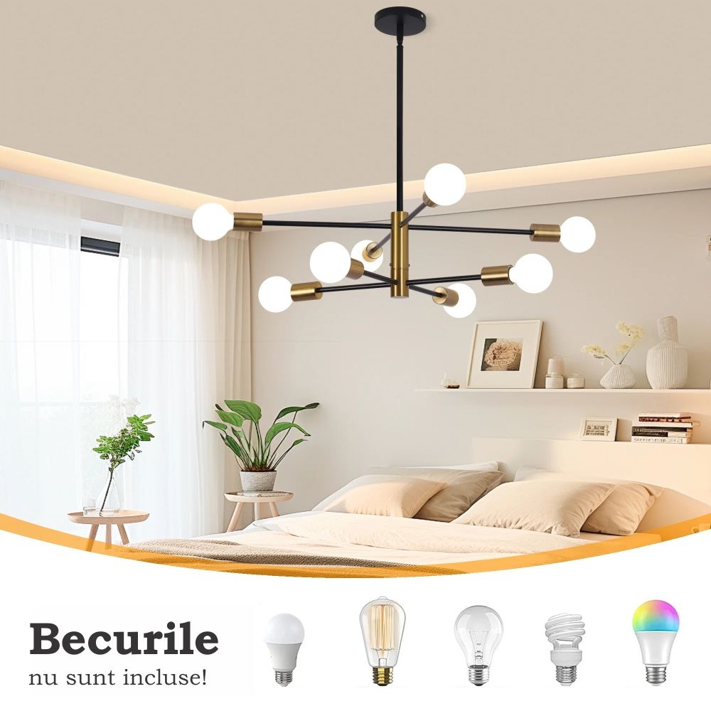 Configurația cu 6 brațe dispuse armonios oferă o iluminare uniformă, iar combinația dintre negru și auriu adaugă un contrast elegant și rafinat.