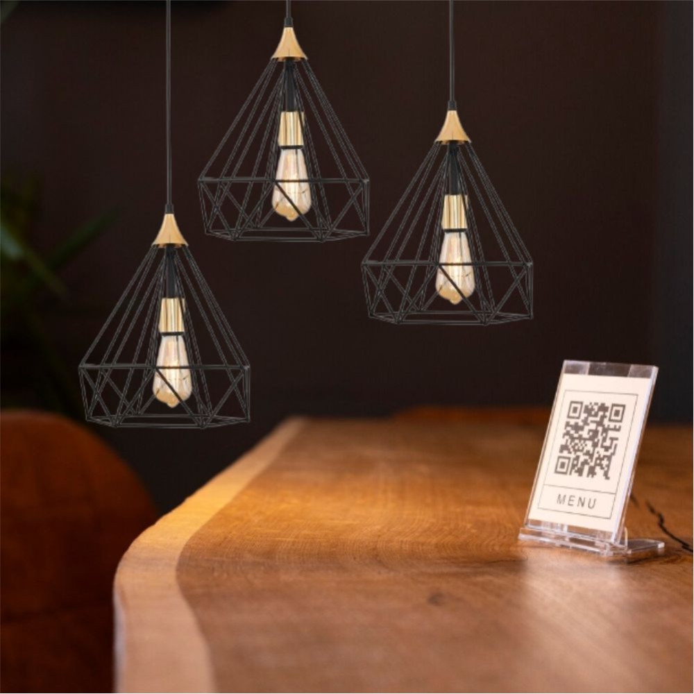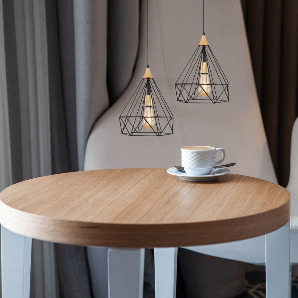 Structura metalică tip cușcă evidențiază becul decorativ și oferă un iluminat plăcut, perfect pentru zonele în care vrei să creezi atmosferă. Finisajul negru mat este completat de detalii aurii, adăugând un contrast modern și sofisticat. Modelele cu design geometric sunt apreciate pentru aspectul lor contemporan și pentru faptul că pun în valoare becurile decorative.