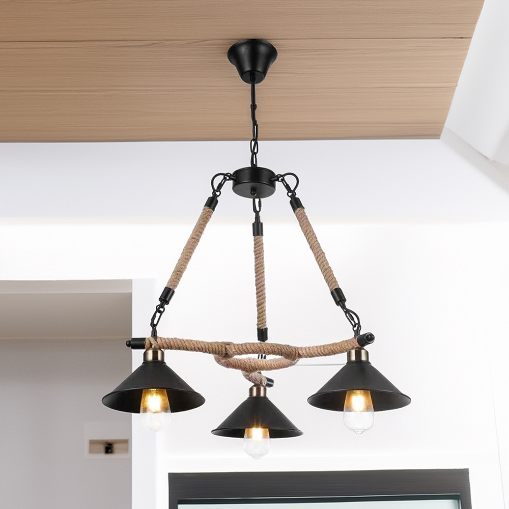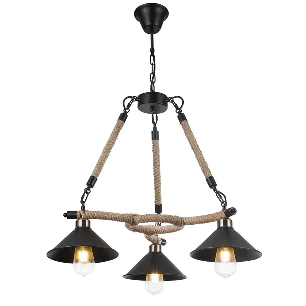 Designul său distinct combină metalul negru cu sfoara groasă, oferind un aspect natural și industrial în același timp. Cele trei surse de iluminare sunt dispuse armonios, asigurând o lumină plăcută și echilibrată.