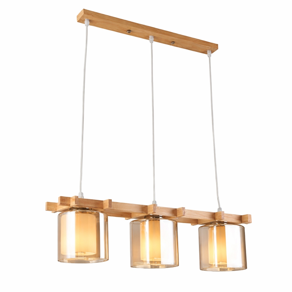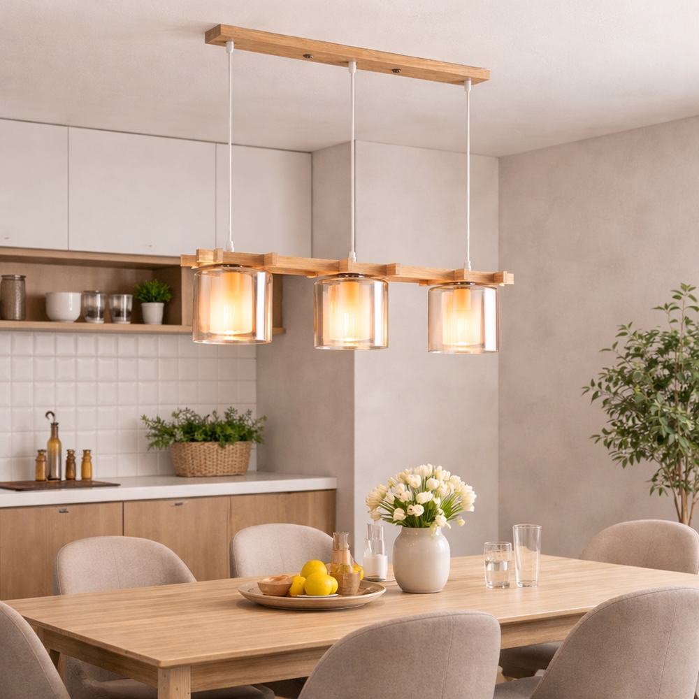 Designul său modern combină armonios textura naturală a lemnului cu transparența caldă a sticlei, creând un ambient plăcut și relaxant. Dispunerea liniară a surselor de lumină o face perfectă pentru iluminarea mesei sau a insulei de bucătărie.