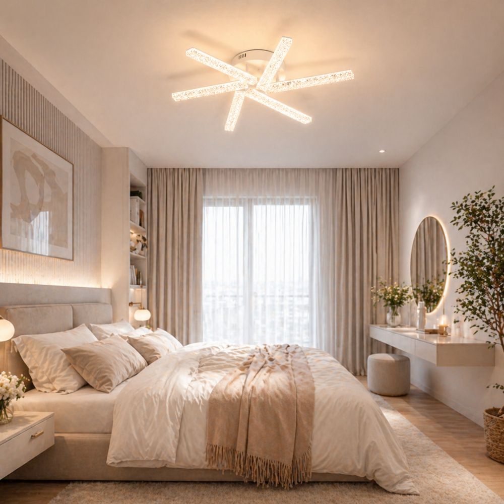 Designul cu 6 brate si elemente din cristal adauga un plus de eleganta si rafinament, fiind potrivit pentru amenajari moderne sau clasice.