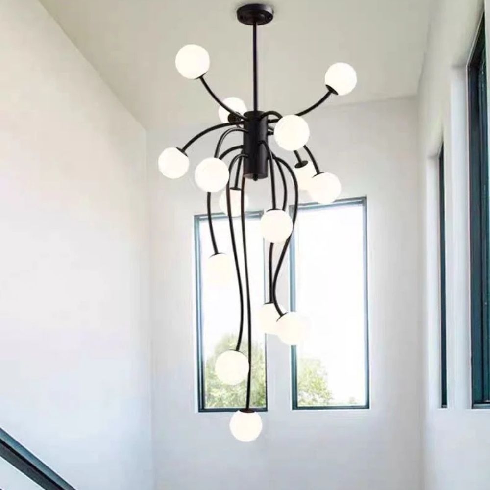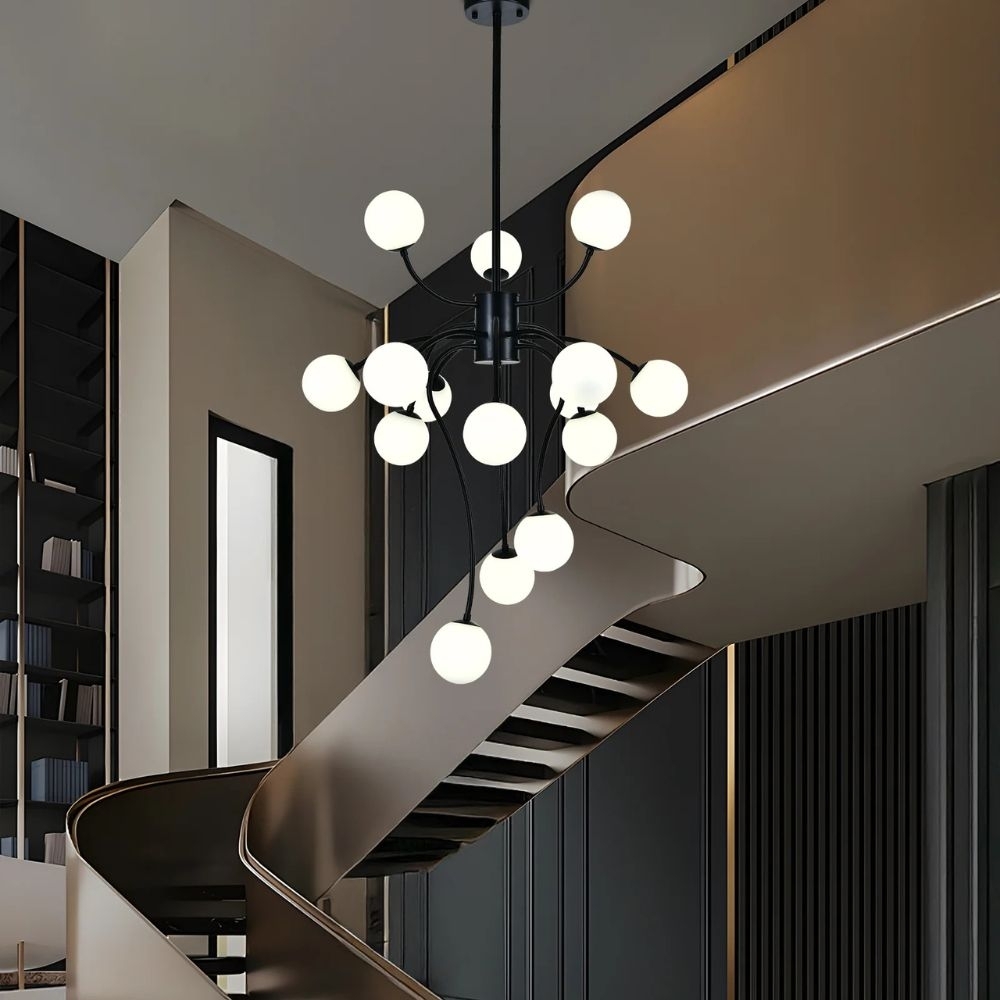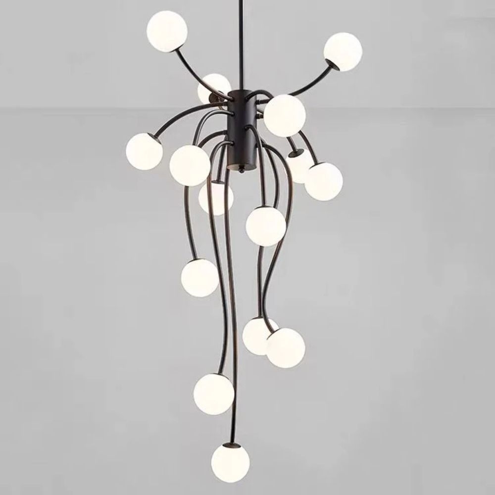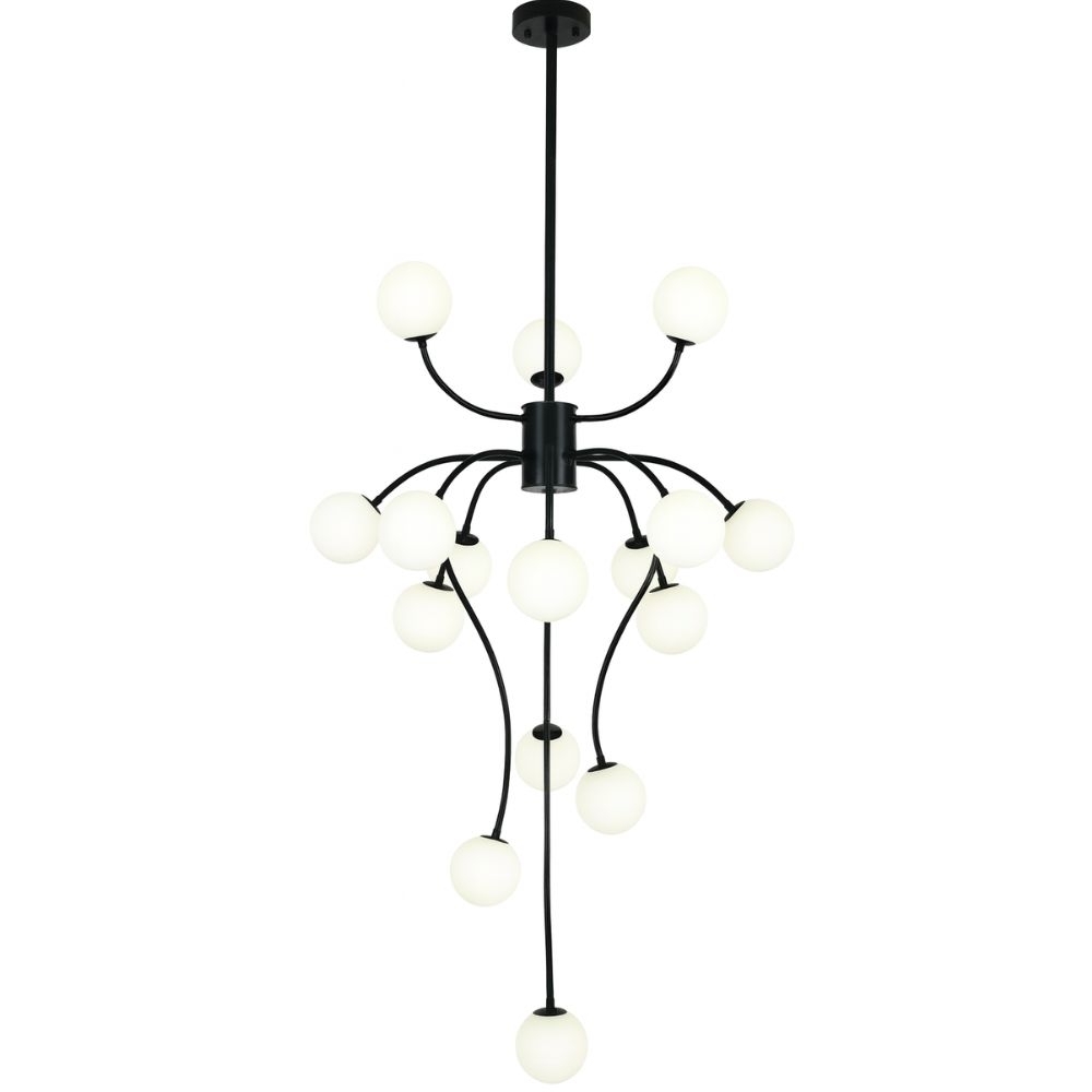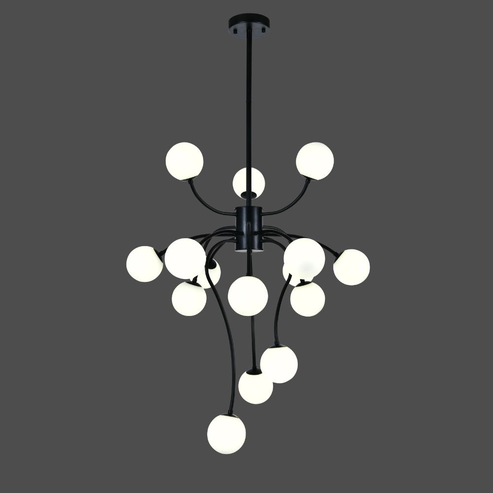 Lustra suspendata E007/15 aduce un plus de rafinament si stil oricarui spatiu interior. Cu 15 abajururi din sticla dispuse armonios pe o structura metalica neagra, ofera un joc de lumina spectaculos si o distributie uniforma a iluminarii.
