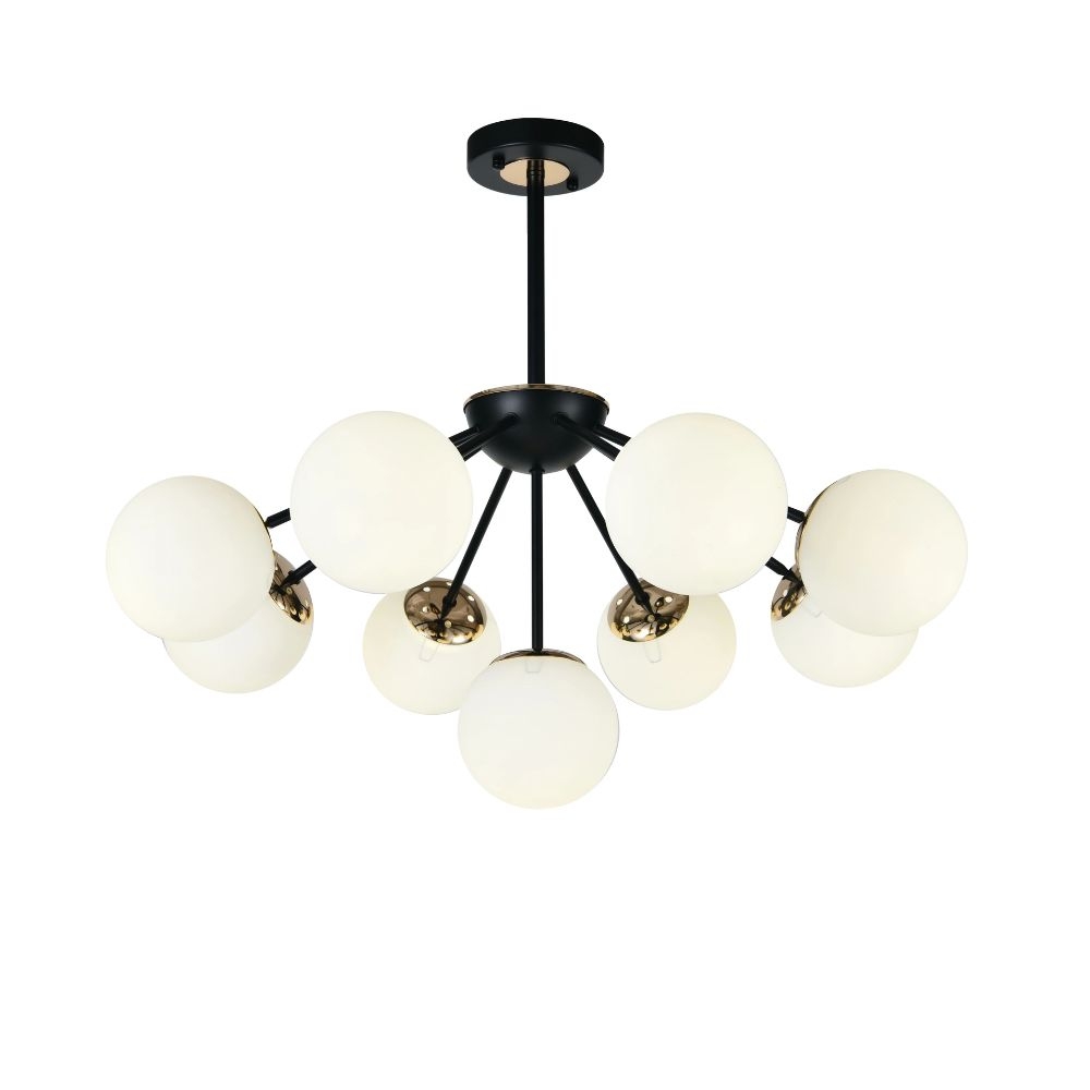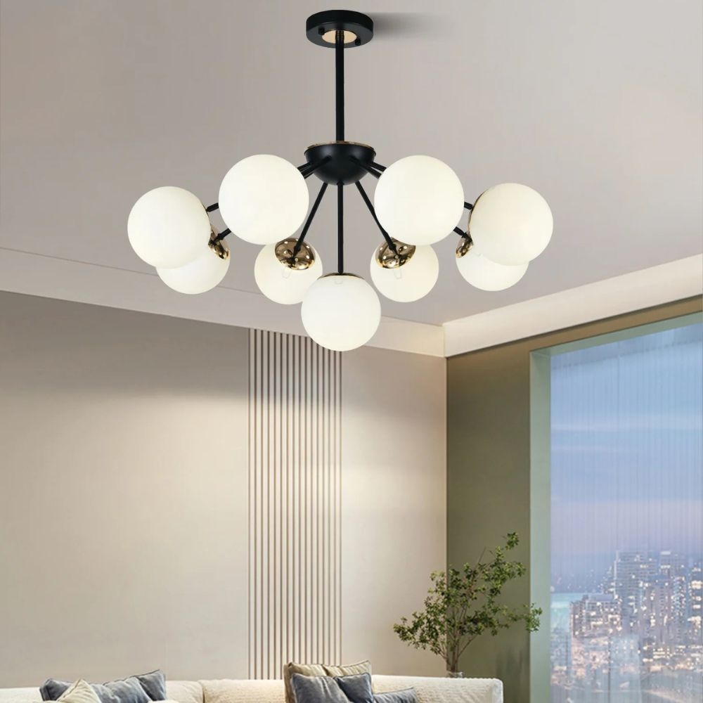 Lustra suspendata RF-N36368-9 combina eleganta moderna cu un design rafinat si echilibrat. Cu 9 abajururi din sticla montate pe o structura metalica finisata in negru mat, aceasta lustra adauga un aspect sofisticat si un plus de lumina ambientala in orice incapere.