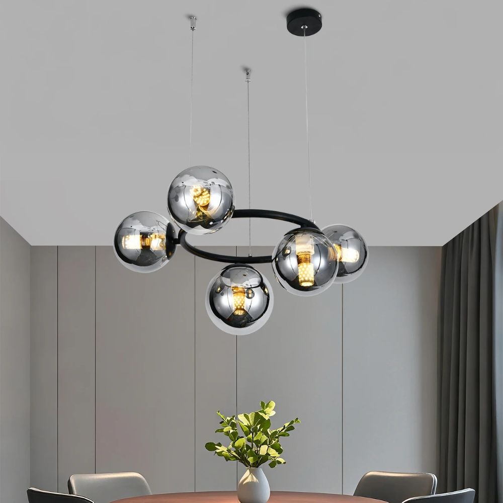 Lustra suspendata RF-N6805-5 imbina eleganta contemporana cu functionalitatea practica, fiind alegerea perfecta pentru incaperile moderne. Cu 5 abajururi din sticla montate pe o structura metalica finisata in negru si crom, aceasta lustra creeaza un contrast rafinat si un efect vizual deosebit.