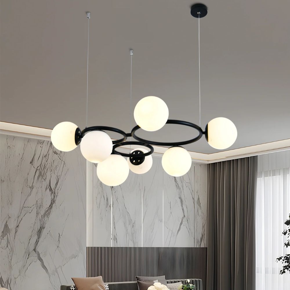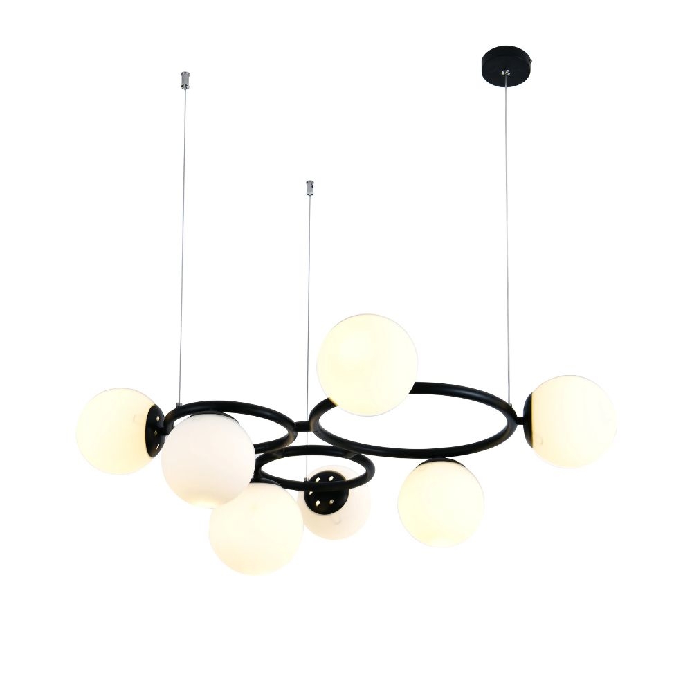 Lustra suspendata RF-N6805-7 aduce un echilibru perfect intre eleganta si simplitate, fiind alegerea ideala pentru incaperile moderne. Cu 7 abajururi din sticla alba si o structura metalica finisata in negru, aceasta lustra creeaza un contrast vizual placut si o lumina uniforma, potrivita pentru livinguri, dininguri, birouri sau spatii comerciale rafinate.
