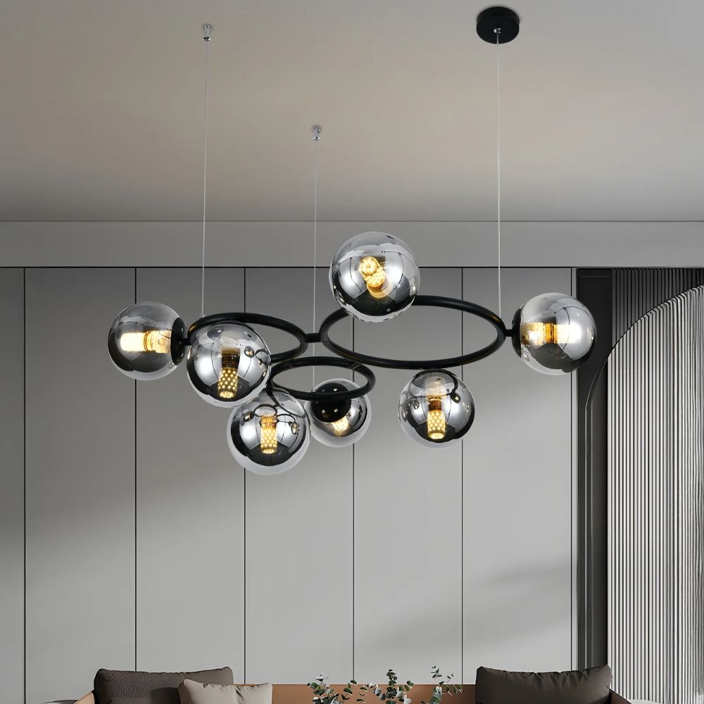 Lustra suspendata RF-N6805-7 imbina perfect eleganta finisajului negru/crom cu functionalitatea moderna. Cu 7 abajururi din sticla montate pe o structura metalica rezistenta, aceasta lustra ofera o iluminare uniforma si un design echilibrat, ideal pentru livinguri, dininguri sau birouri contemporane.