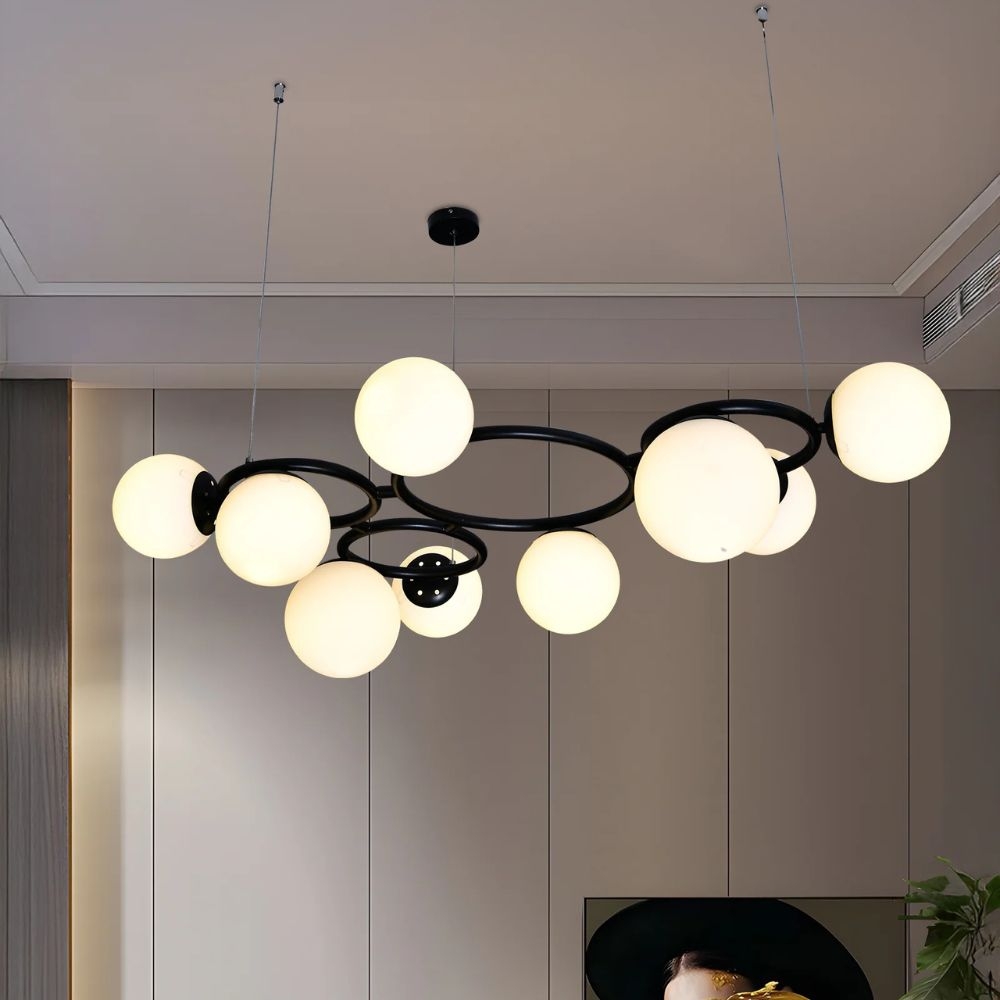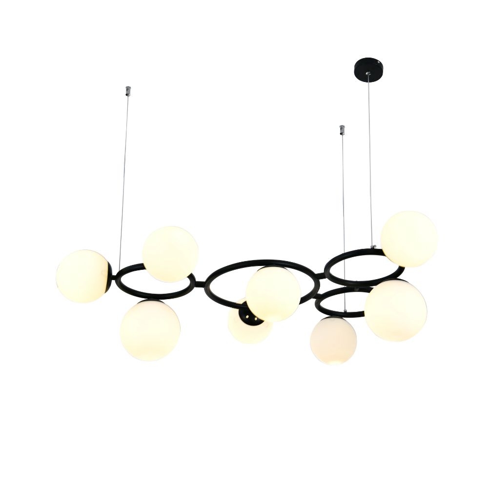 Lustra suspendata RF-N6805-9 in nuante elegante de negru si alb aduce un plus de rafinament oricarui spatiu interior. Cu 9 abajururi din sticla dispuse armonios pe o structura metalica rezistenta, aceasta lustra ofera o iluminare uniforma si o estetica moderna, potrivita pentru livinguri, dininguri sau birouri contemporane.