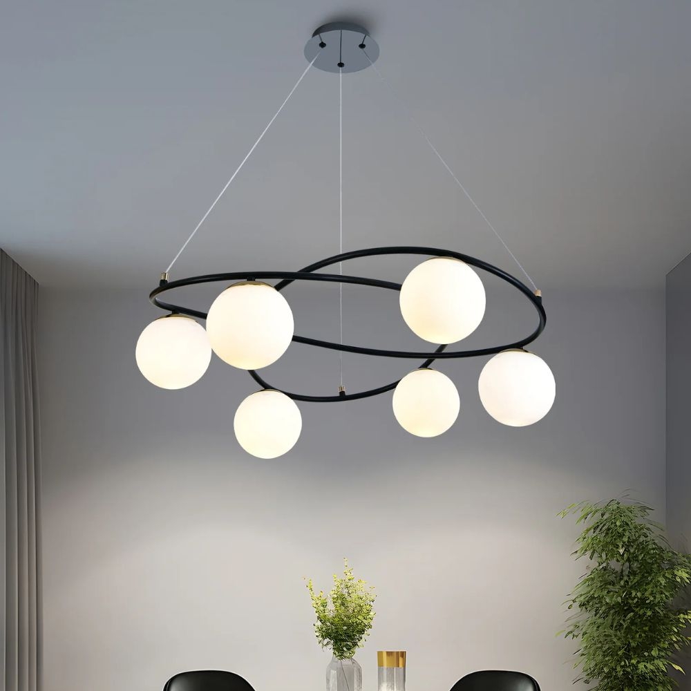 Lustra suspendata RF-N6806-6 aduce o nota moderna si rafinata oricarui spatiu interior. Cu 6 abajururi din sticla alba si o structura metalica finisata in negru mat, aceasta lustra imbina eleganta contemporana cu functionalitatea practica.