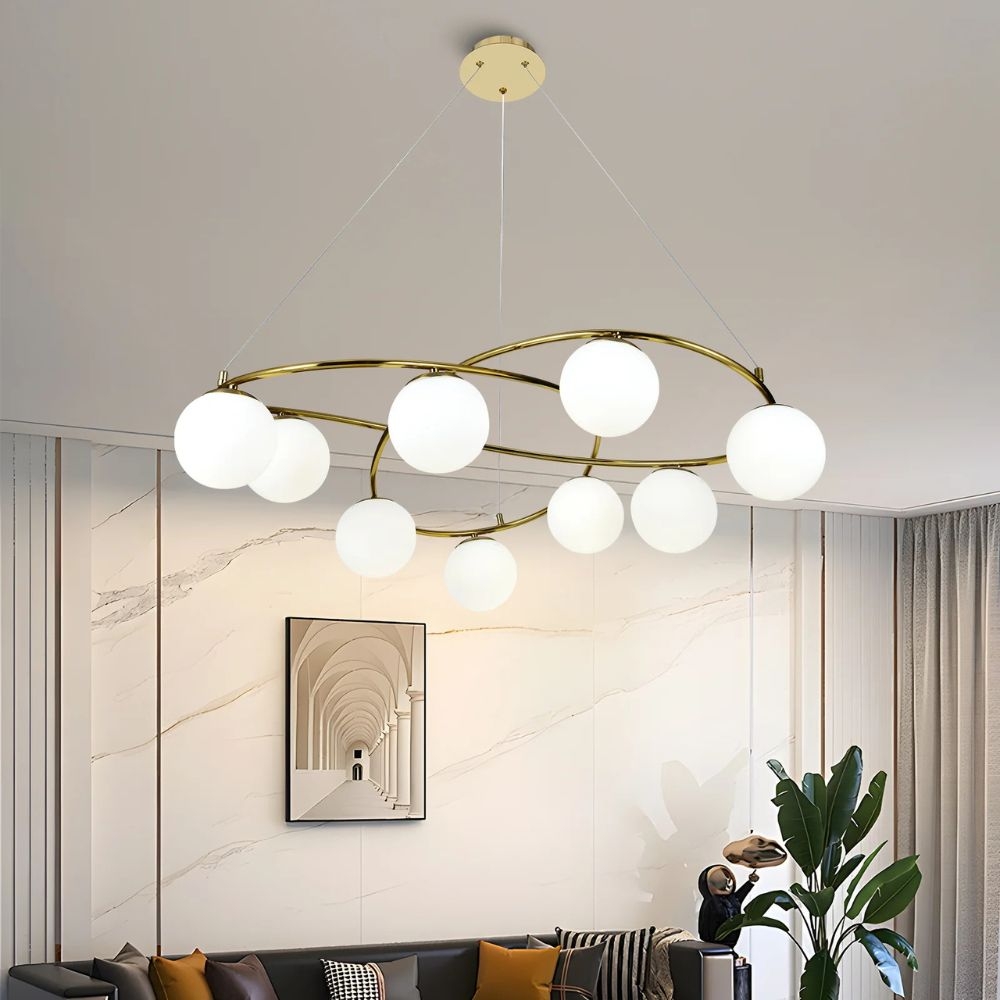 Lustra suspendata RF-N6806-9 impresioneaza prin designul sau elegant si modern, aducand o nota luxoasa oricarei incaperi. Cu 9 abajururi din sticla alba sustinute de o structura metalica finisata in auriu, aceasta lustra ofera o lumina echilibrata si un aspect vizual sofisticat.