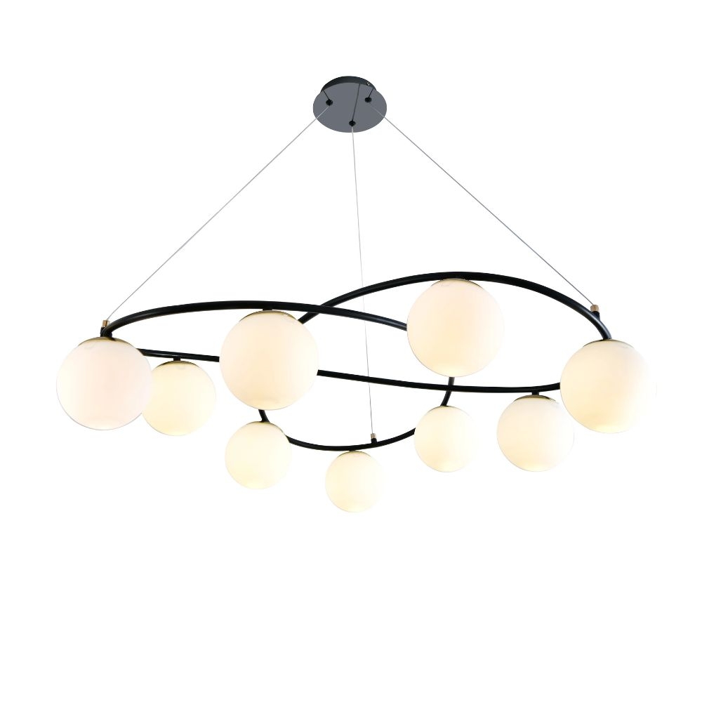 Lustra suspendata RF-N6806-9 imbina designul modern cu functionalitatea, oferind o solutie eleganta de iluminat pentru interioare contemporane. Cu 9 abajururi din sticla alba si o structura metalica finisata in negru mat, aceasta lustra adauga un contrast rafinat si o nota de stil in orice incapere.