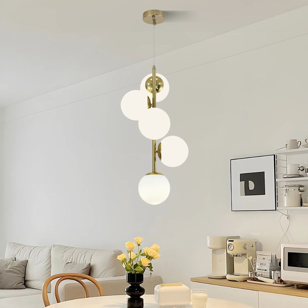 Pendulul RF-N6803-5GD adauga eleganta si rafinament oricarui spatiu interior. Cu 5 abajururi din sticla sustinute de o structura metalica aurie, acest pendul ofera o lumina uniforma si placuta, perfecta pentru zonele de dining, living, birouri sau restaurante.