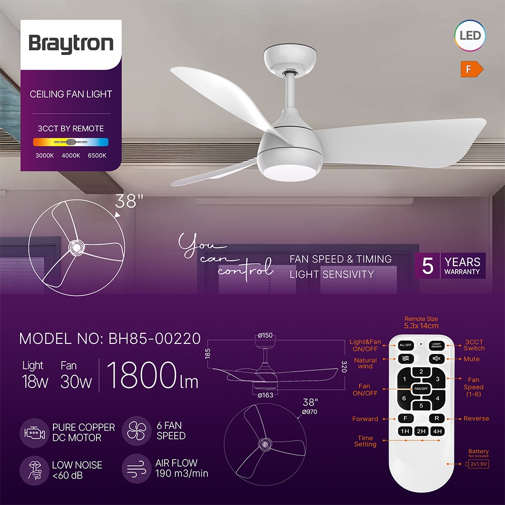 Plafoniera LED cu ventilator BRAYTRON FANCY 38”, 18W + 30W, 3CCT, cu telecomanda este o solutie moderna si compacta pentru iluminat si ventilatie, ideala pentru camere de dimensiuni mici si medii.