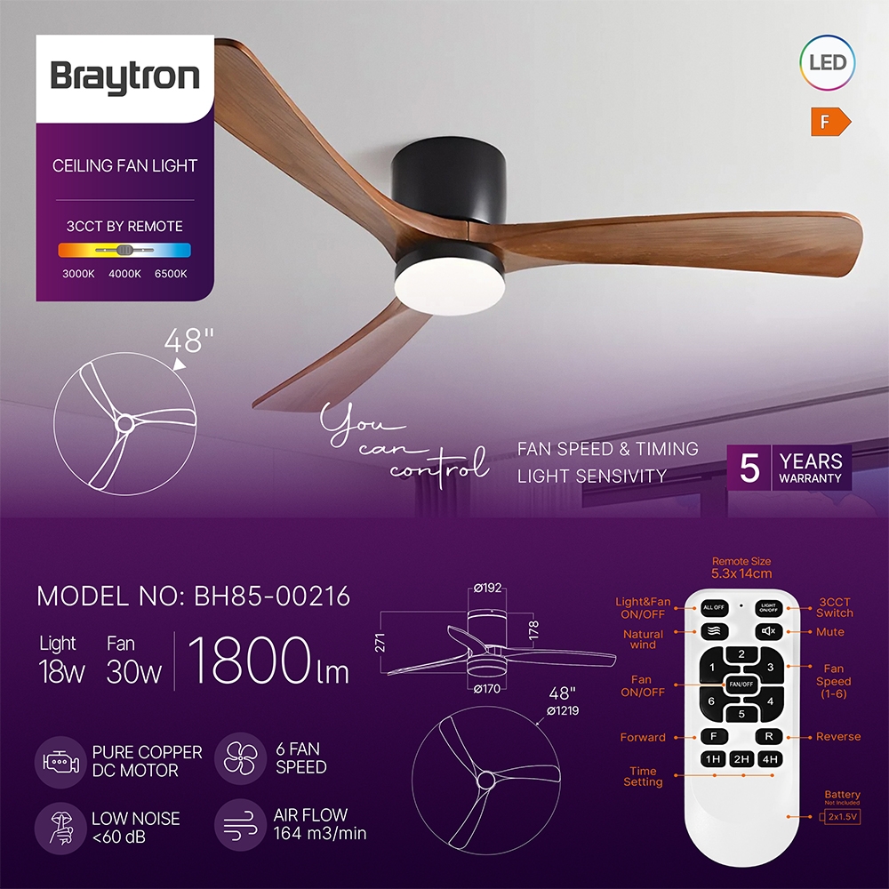 Plafoniera LED cu ventilator BRAYTRON FANCY 48”, 18W + 30W, 3CCT, cu telecomanda este o solutie moderna pentru iluminat si ventilatie, ideala pentru spatii medii si mari unde conteaza atat functionalitatea, cat si designul.