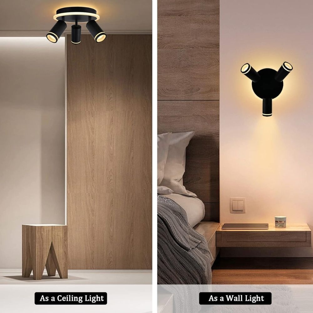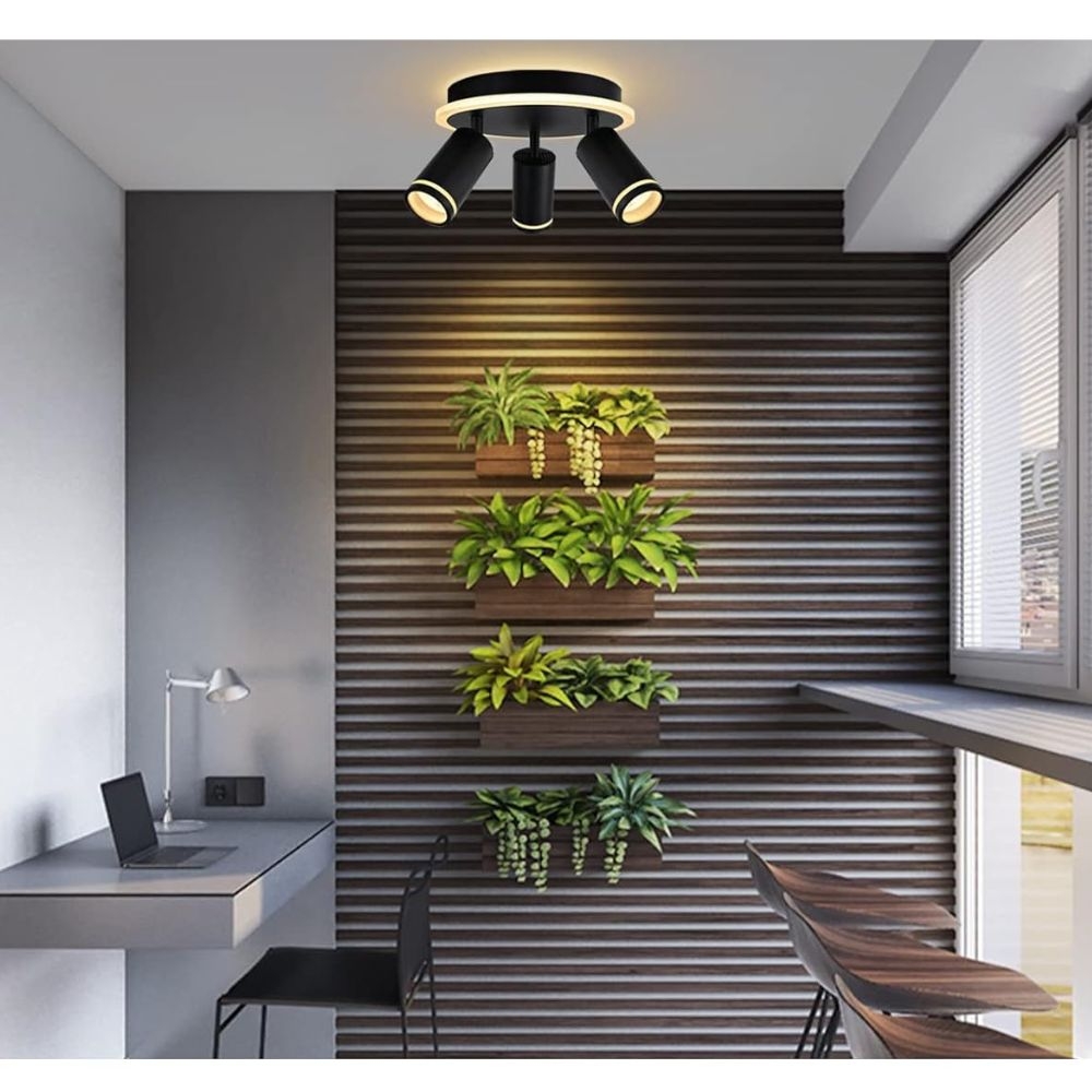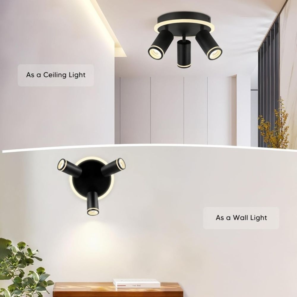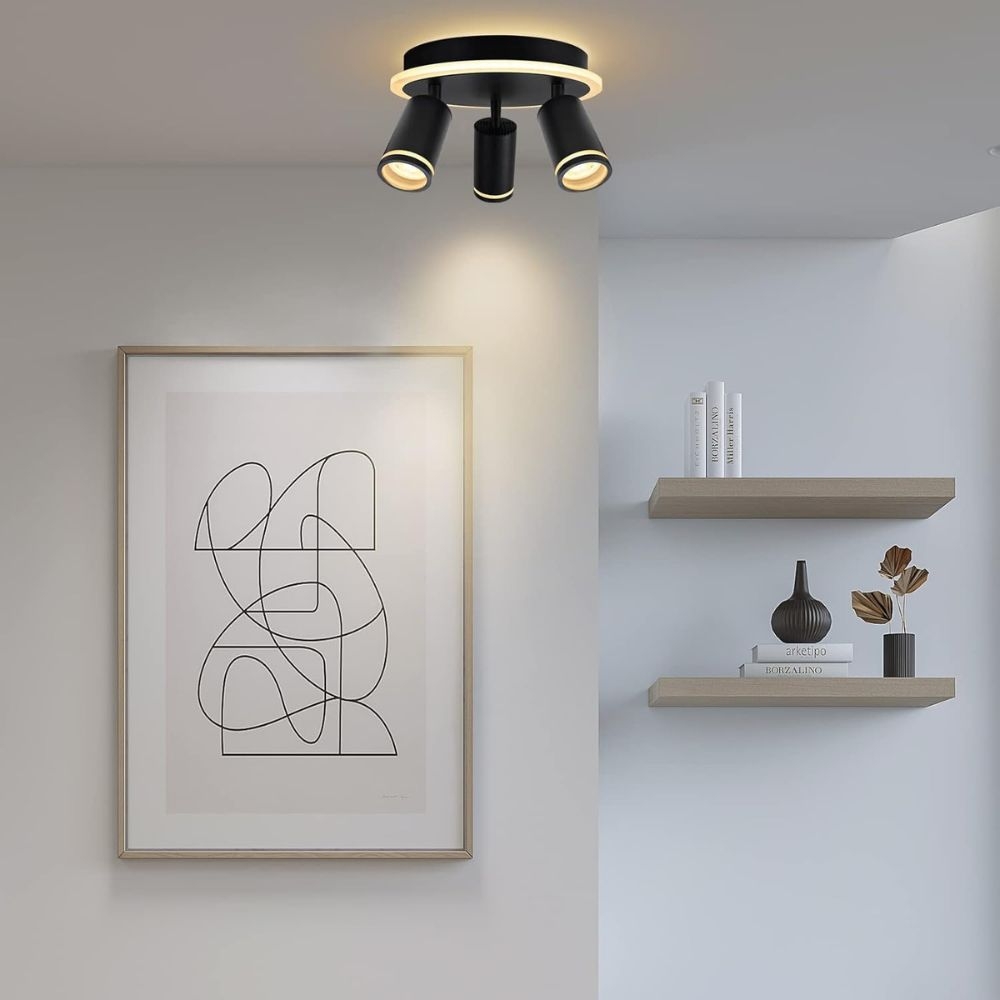 Plafoniera dispune de 3 temperaturi de culoare selectabile: 3000K (lumina calda), 4000K (lumina neutra) si 6000K (lumina rece), permitand adaptarea luminii in functie de activitate si atmosfera dorita. Cele 3 spoturi orientabile permit directionarea luminii catre zonele importante, in timp ce baza luminata contribuie la o distributie uniforma a luminii in incapere.