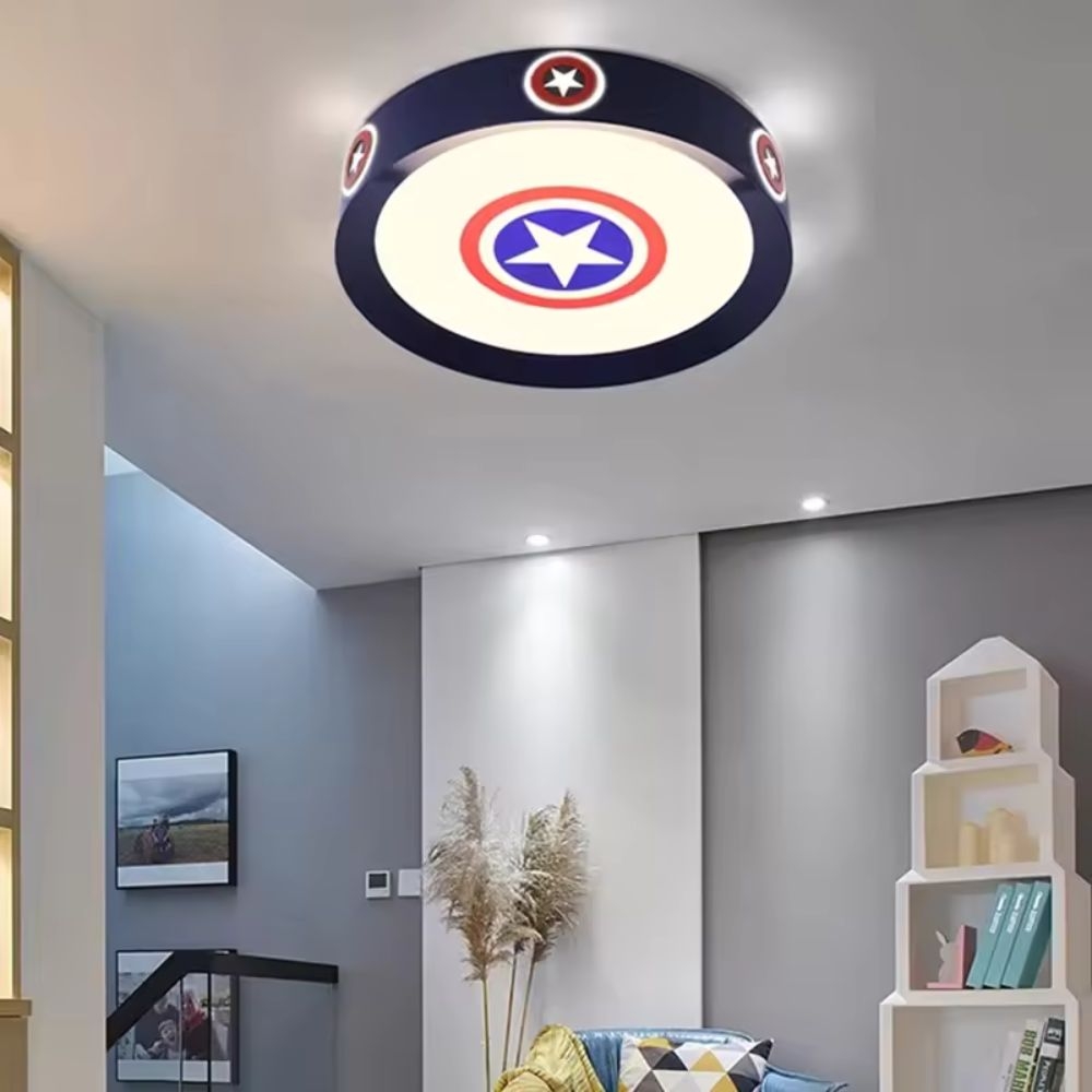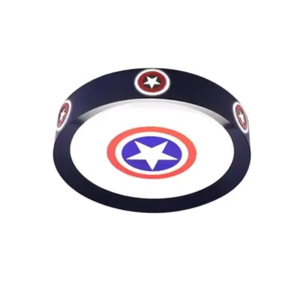 Transformă camera copilului tău într-o scenă plină de acțiune și inspirație cu lustra noastră vibrantă, inspirată de scutul emblematic al lui Captain America din universul Avengers.